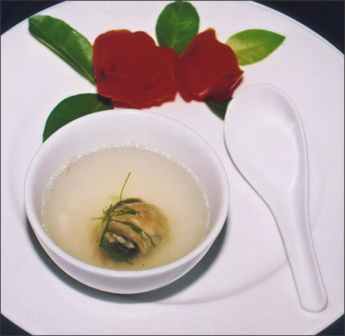Dùng kèm với xì dầu pha nước dùng (3 muỗng canh xì dầu + 1 muỗng canh nước dùng ninh từ xương heo hoặc gà) hải sản tươi .